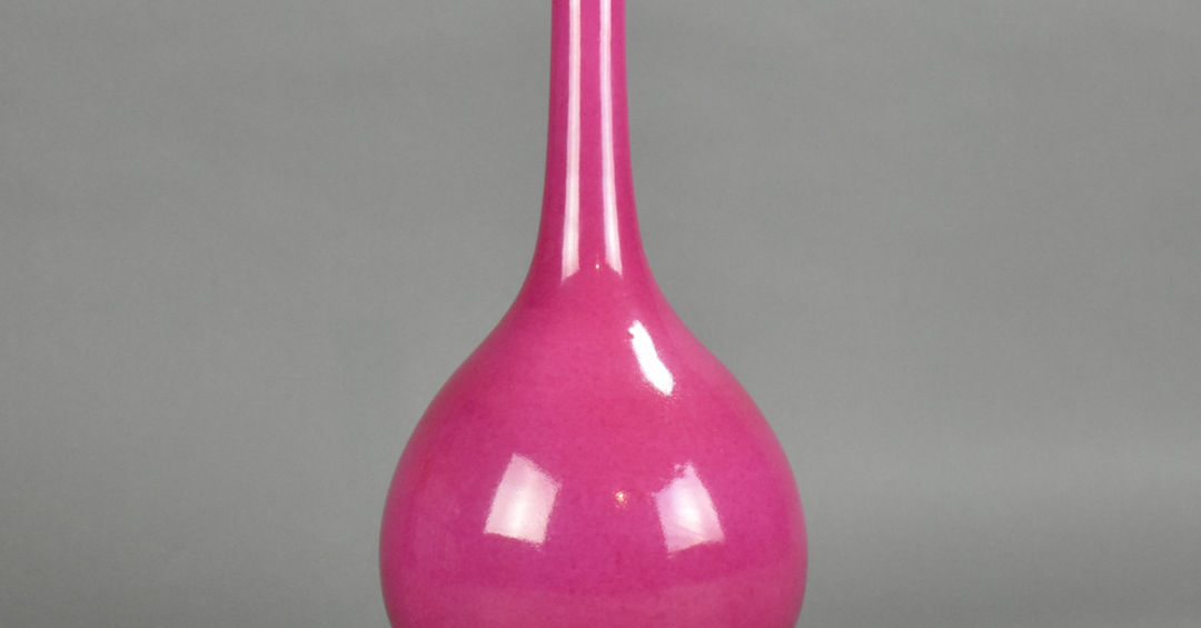 19th century, well formed with a bulbous body rising to a tall, slender neck, covered overall in a ruby pink glaze, the base glazed white with an iron red Qianlong seal mark
