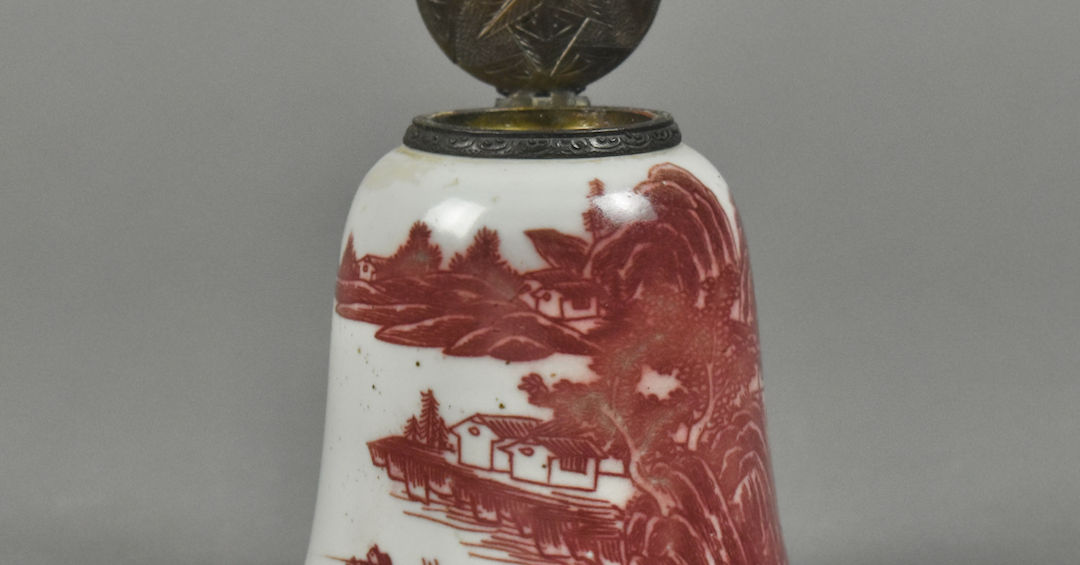 18th century, of bell shape painted in the round with a landscape scene in a saturated red, later mounted as an inkwell with metal lid and rim, the lid with a jadite finial, base with an underglazed blue mark obstructed by a metal screw, collection sticker on base.