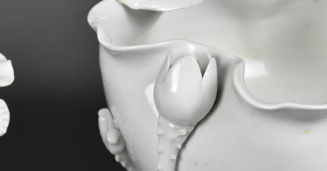 19th century, each molded in the form of a undulating lotus leaf, the exterior with applied further leafy stems, blossoming flowers and pods rising from the base forming the feet and up the sides and over the rim, covered overall in a thick white glaze.