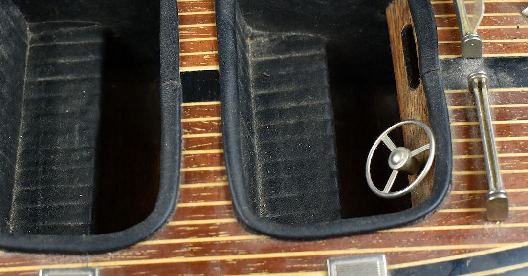 25 1/4" wooden model of a classic 1920's style speed boat, chrome stand